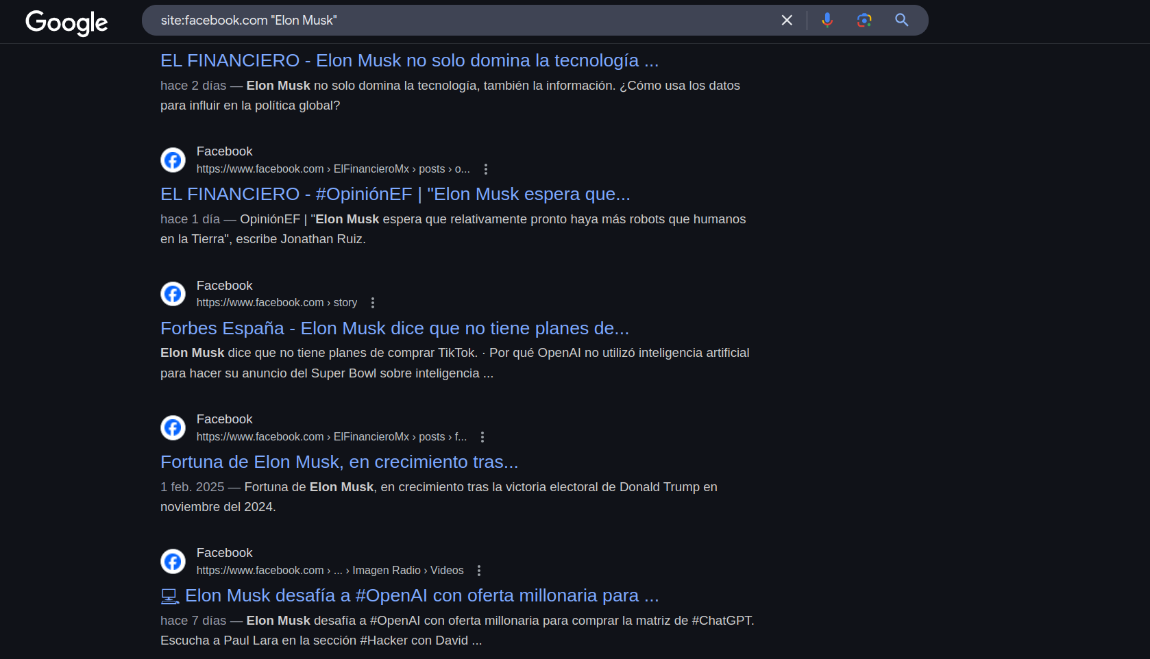 Con esto lo que le estamos diciendo es “Che google, quiero que para este sitio llamado facebook.com me busques la palabra Elon Musk”, si el filtro logra encontrar algo la información se va a representar de la siguiente forma: