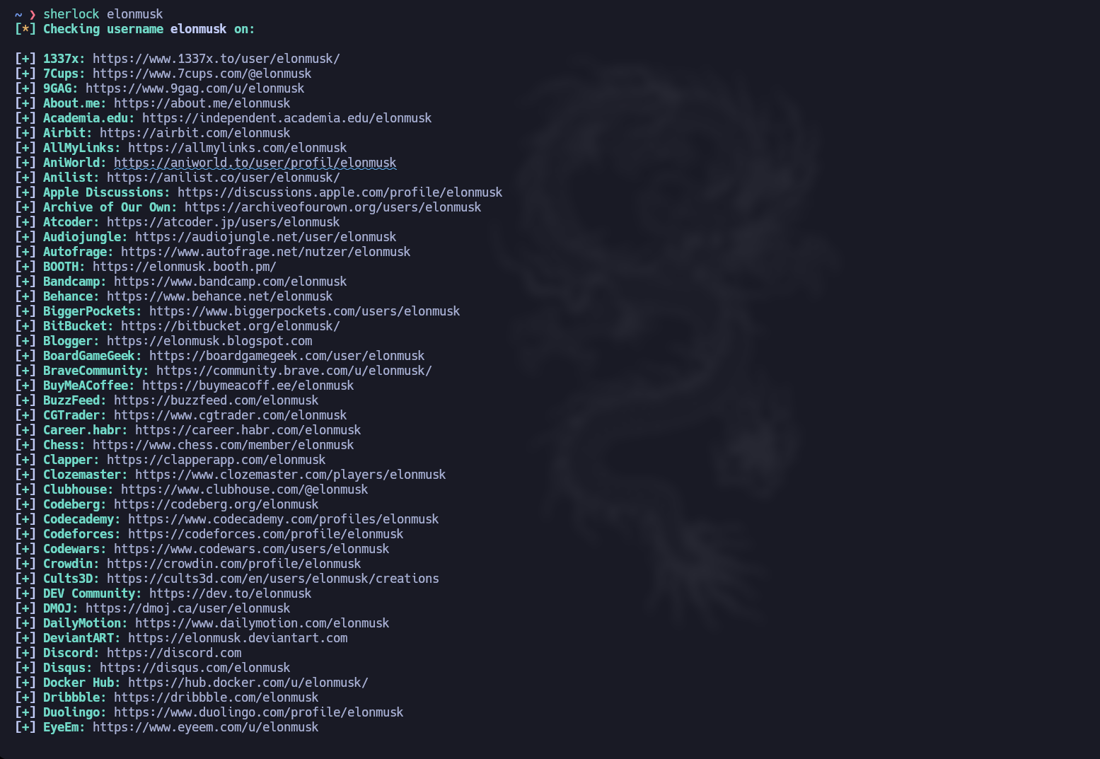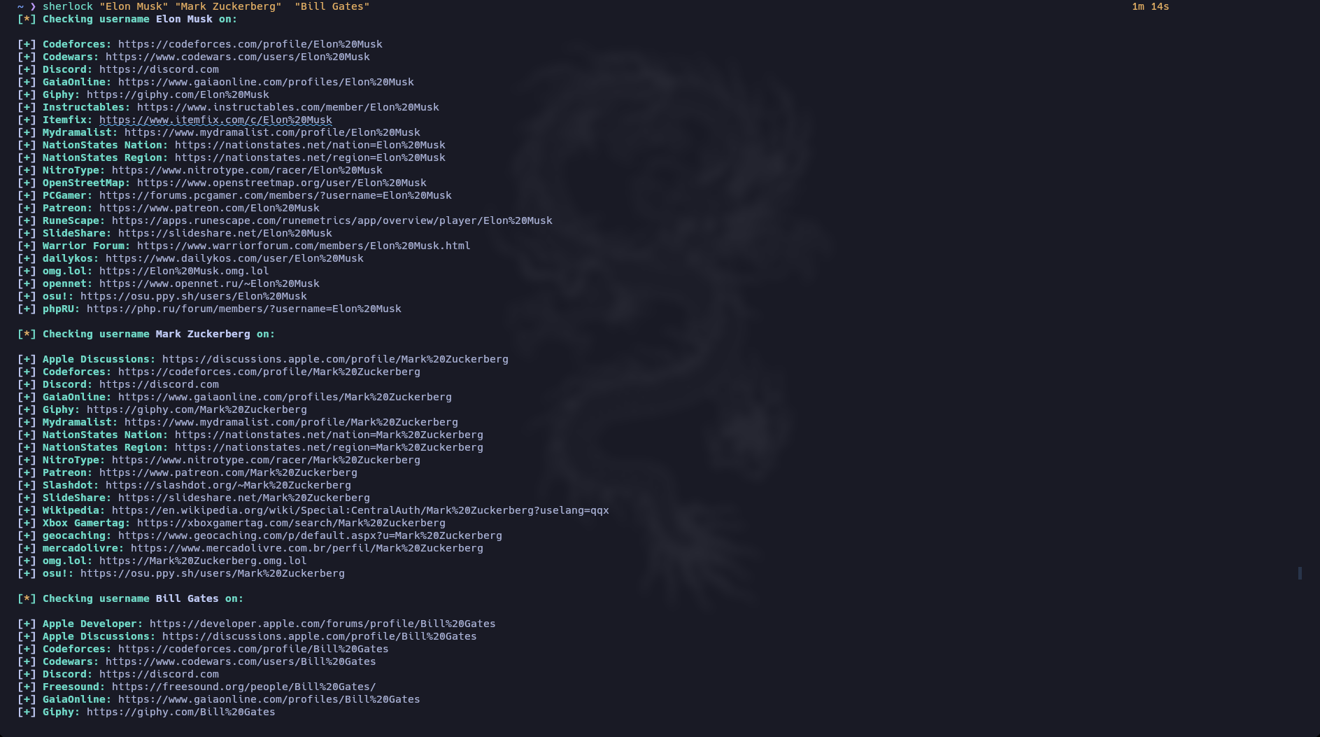 sherlock usuario1 usuario2 usuario3Si querés hacer una búsqueda más específica de alguien con nombre y apellido, como Elon Musk, es recomendable escribirlo entre comillas:
