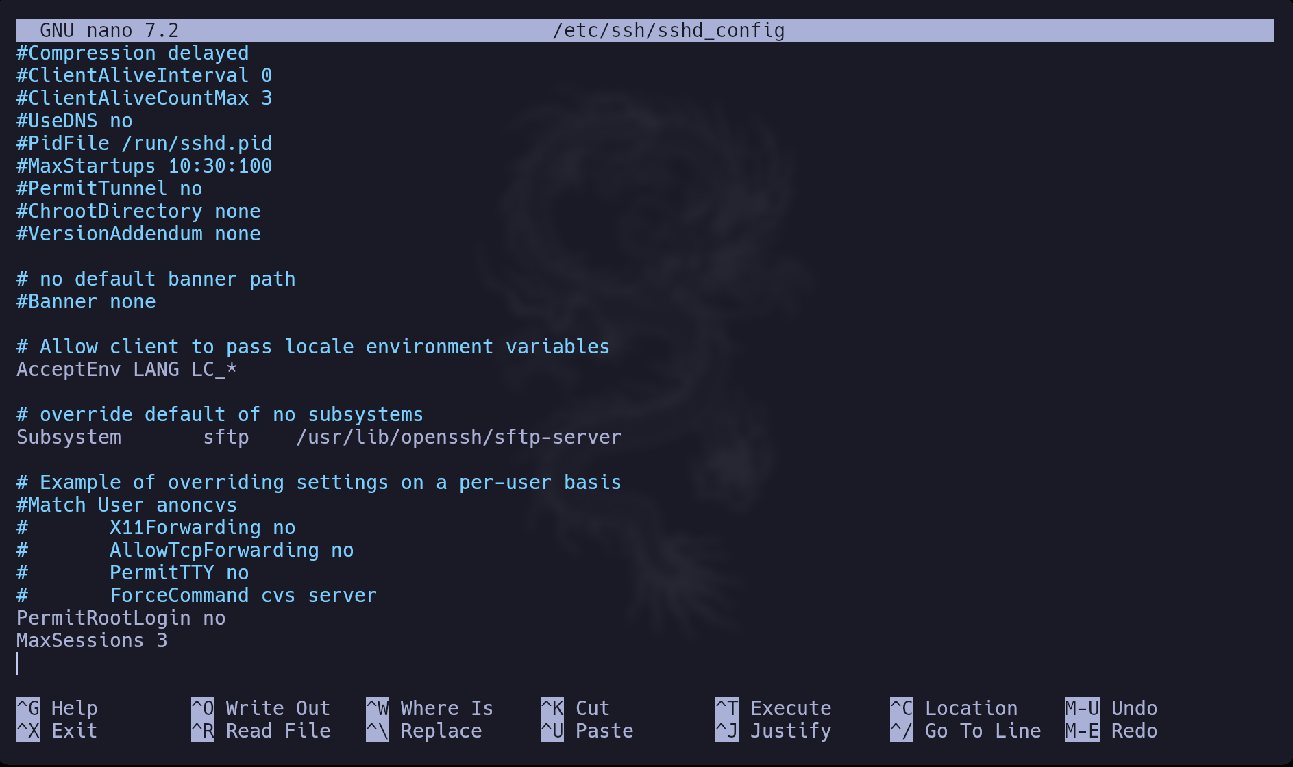Segundo, vamos a limitar la cantidad de conexiones validas por ssh al servidor, a mi personalmente me gusta solo dejar 3 conexiones, para esto vamos a agregar la siguiente linea: MaxSessions 3