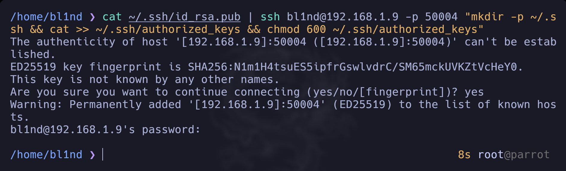 Ahora, una vez que la llave pública esté creada, la movemos al directorio de claves autorizadas del servidor SSH. Para eso, usamos el siguiente comando: