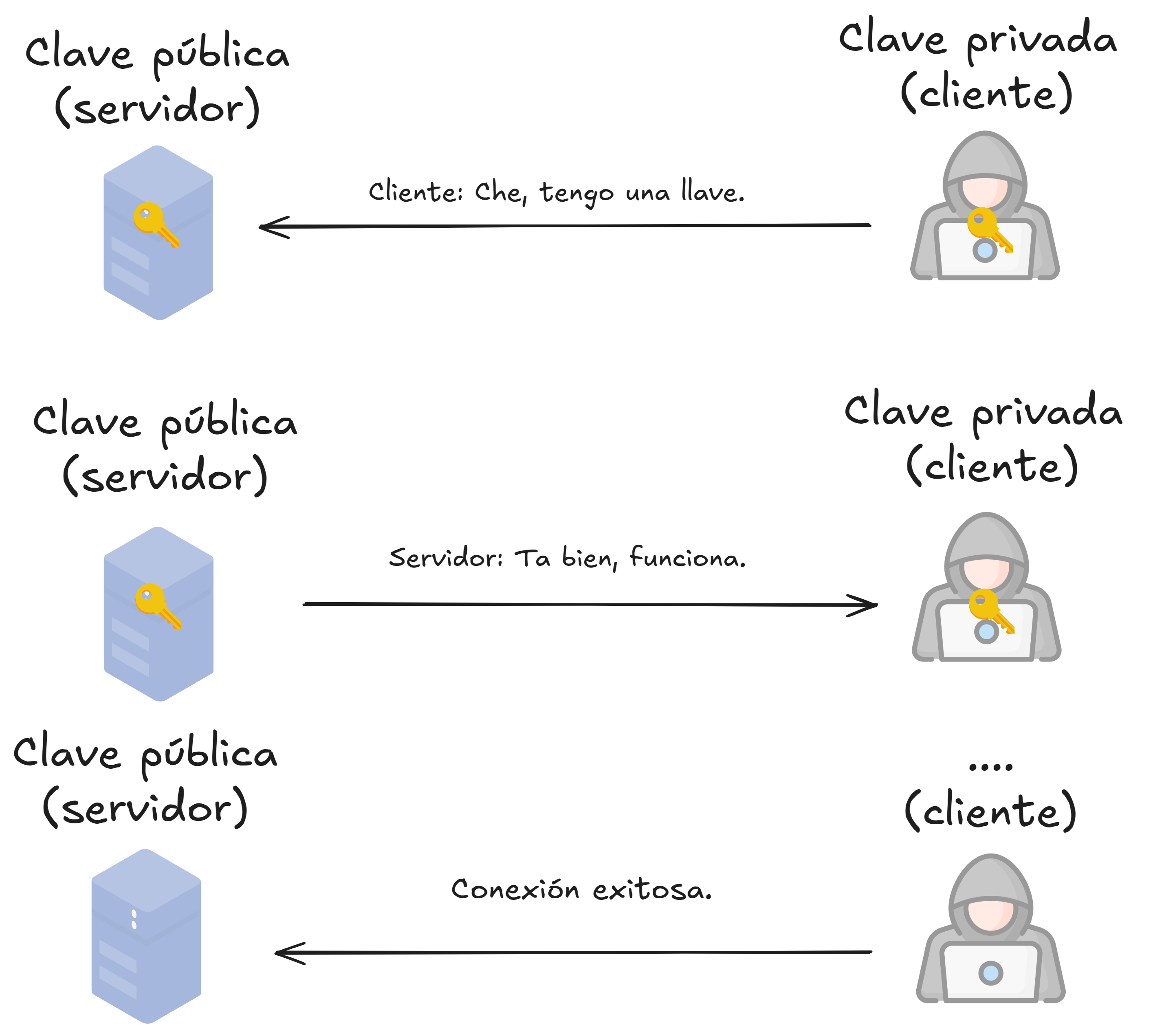 Cuando te querés conectar a un servidor con SSH, el servidor usa tu llave pública para mandarte un desafío, y solo con tu llave privada podés resolverlo. Si la tenés bien guardada, entrás sin necesidad de meter una contraseña cada vez.