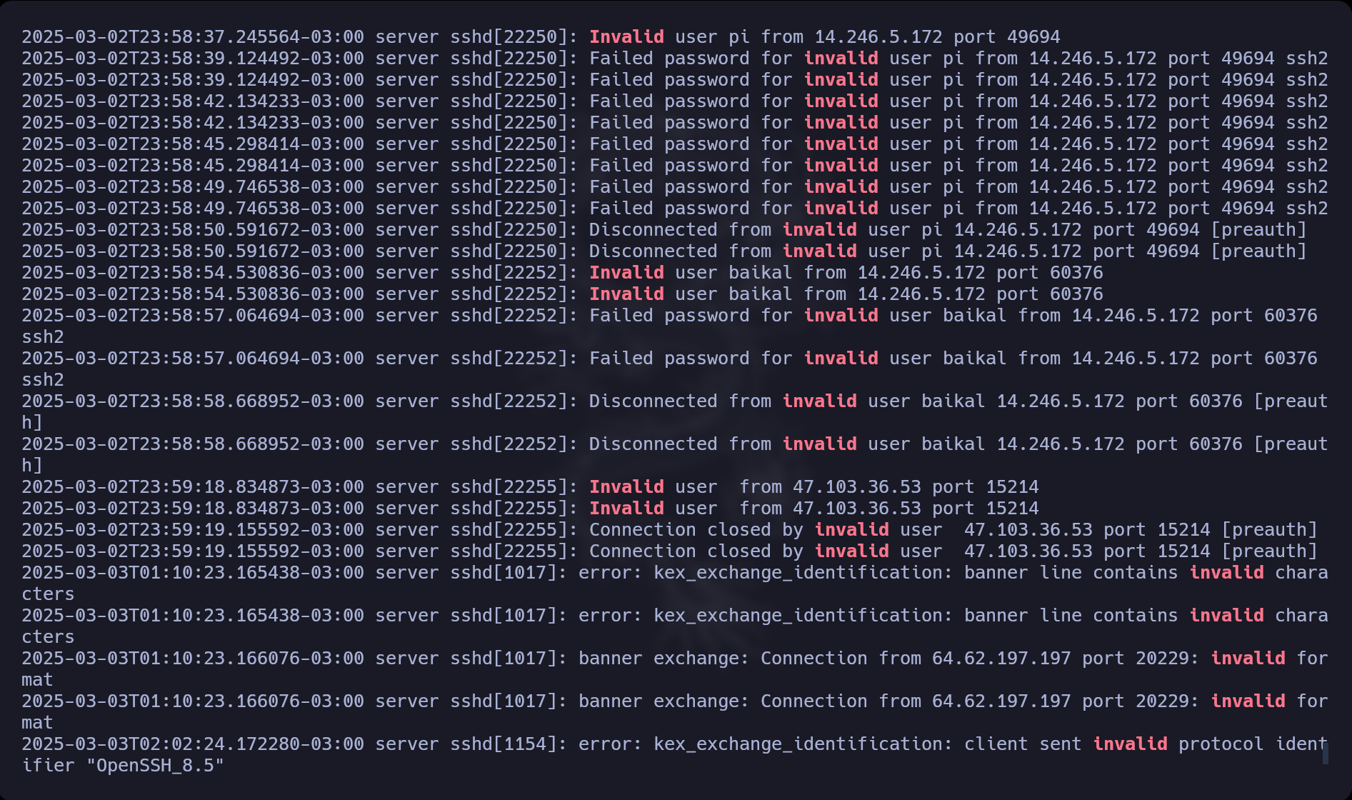 Tengo la costumbre de revisar los logs del sistema para monitorear el rendimiento, el consumo y otros detalles. Mientras usaba journalctl para analizar algunos registros, noté algo extraño: había intentos de conexión que yo no había realizado. Intrigado, fui directo al auth.log.