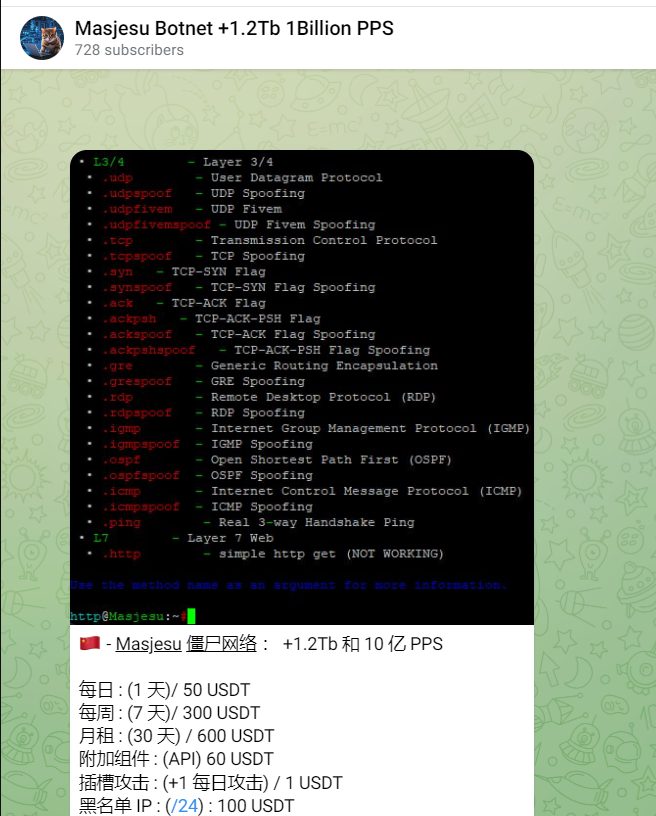 Una cosa aún más importante a destacar es que esta botnet tiene un canal en Telegram (público) donde se pueden comprar los servicios de la botnet. Aunque Masjesu todavía parece ser una botnet pequeña, ya tiene suficiente potencial para causar estragos, y esto se sabe porque lo venden como un servicio tipo SaaS (Software as a Service). Básicamente, cualquiera con algo de plata puede alquilarla para usarla en sus propios ataques.