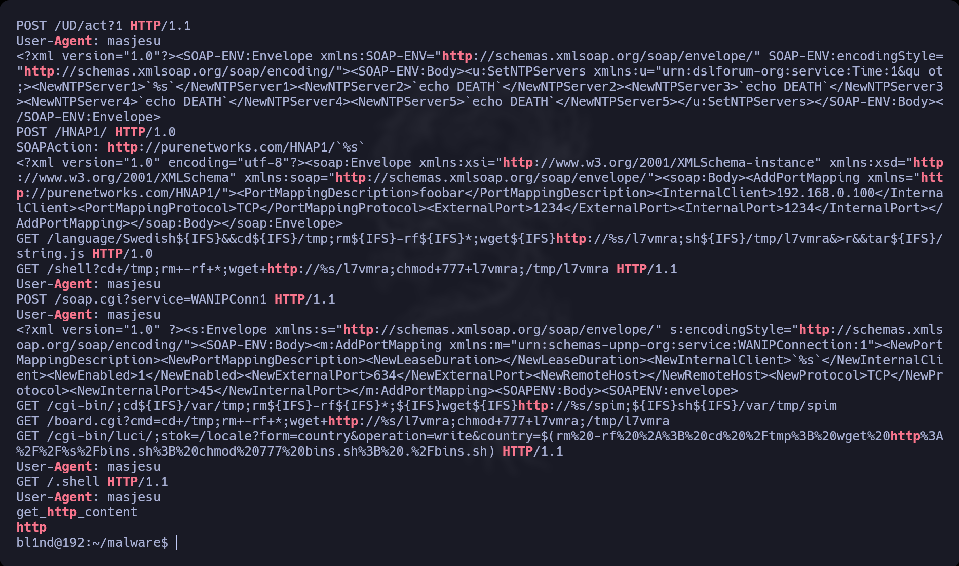 Primero, parece que Masjesu es una botnet que “apunta a absolutamente todo”, lo que significa que no discrimina entre dispositivos, atacando todo lo que pueda. Esto tiene sentido, porque al analizar el malware que intentaron meterme, se veía claro que estaba diseñado para explotar vulnerabilidades en dispositivos de diferentes fabricantes de red (como ya vimos).