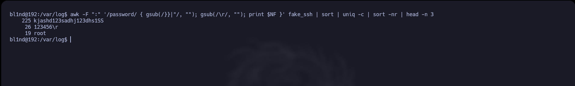awk -F ":" '/password/ { gsub(/}}|"/, ""); gsub(/\r/, ""); print $NF }' fake_ssh | sort | uniq -c | sort -nr | head -n 3