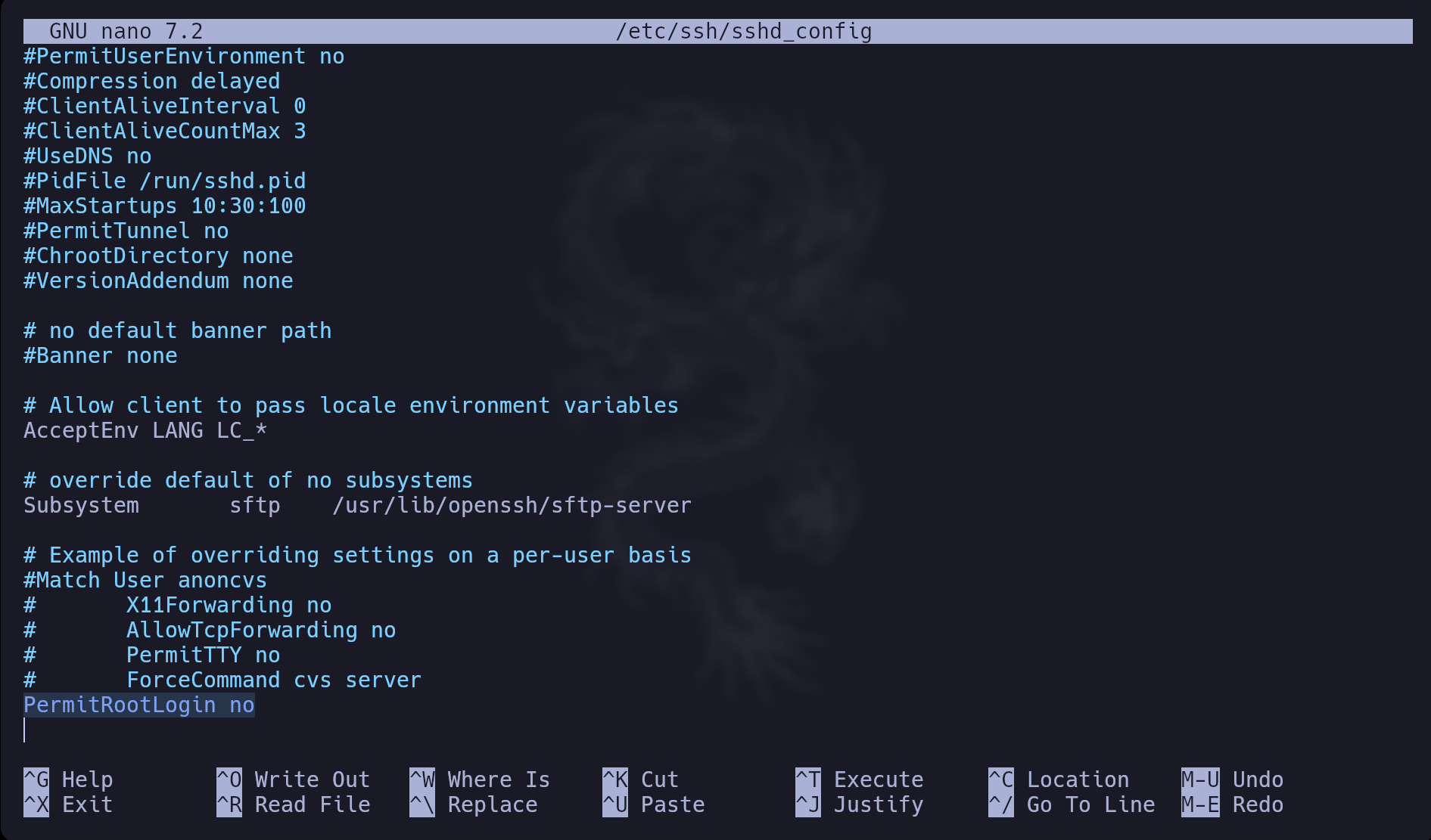 Ahora, vamos a buscar la linea que dice PermitRootLogin y vamos a ponerle ‘no’, en caso de que no encuentren la linea PermitRootLogin pueden simplemente agregarla:
