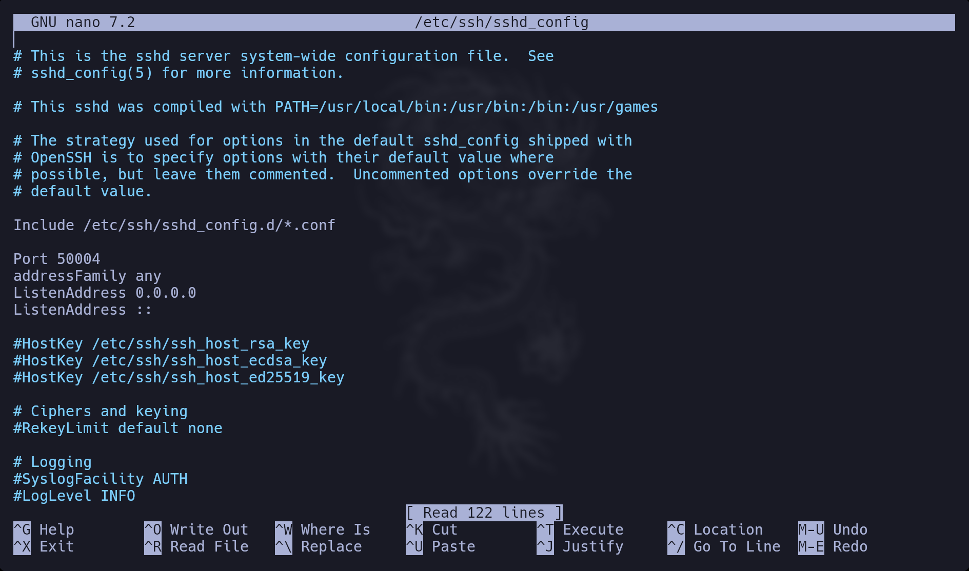 Una vez estando acá, vamos a aprovechar para hacer algo, donde dice Port lo mas seguro es que por defecto este en el puerto 22. En este caso para dar una capa mas de seguridad lo vamos a cambiar a cualquier otro, por ejemplo el 50004 (Existen un total de 65536 puertos). Este cambio lo hacemos porque por lo general los BOTS están programados para analizar el puerto 22.